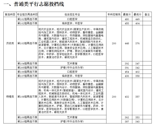 历史类中临床医学、中医学专业最低分 404 分,物理类最低分 358 分。